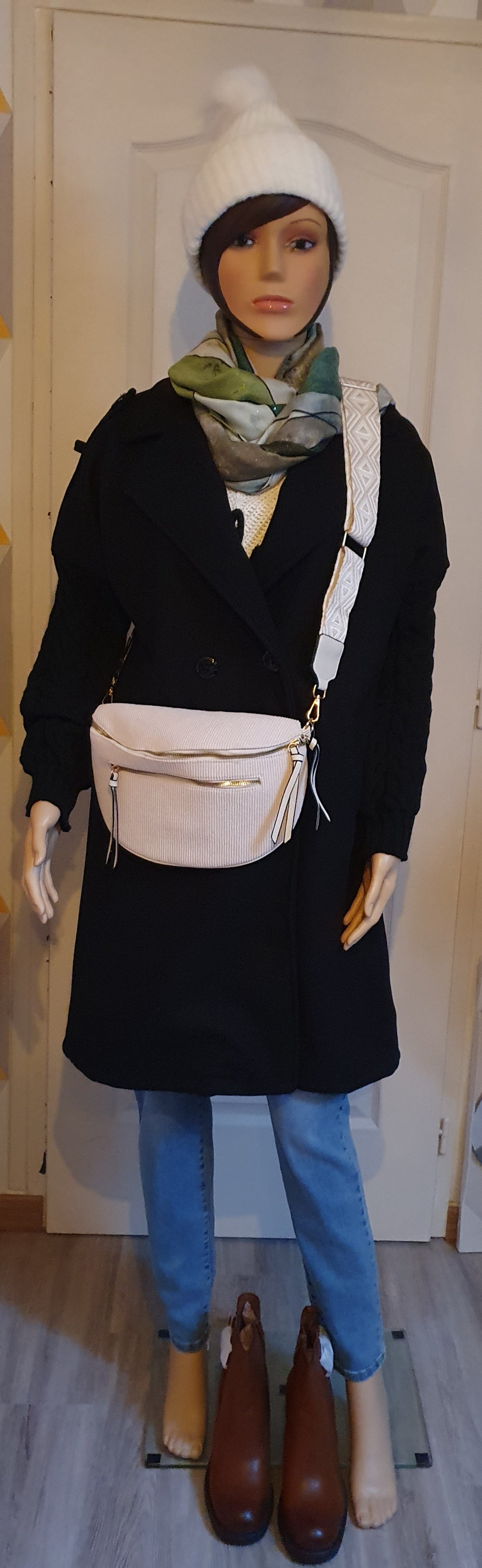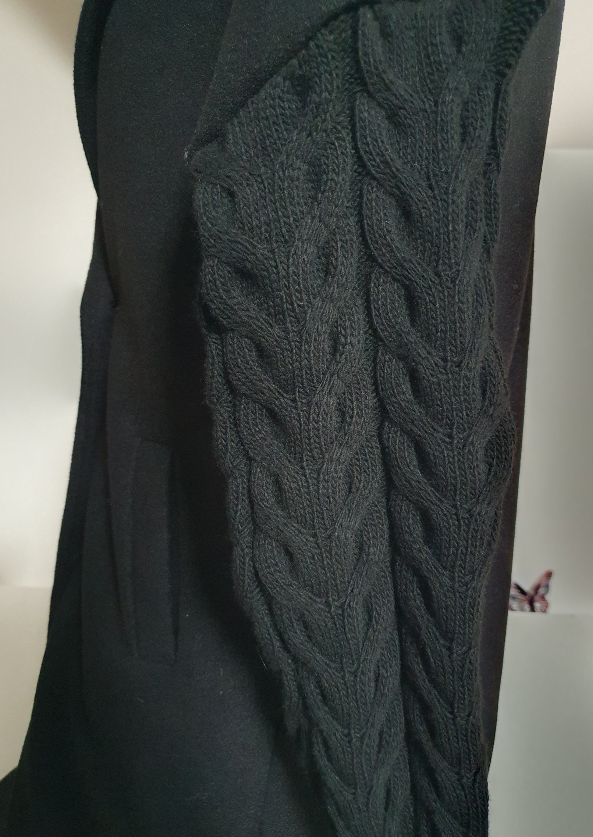 Joli manteau long bien chaud avec poches. Manches torsadées en tricot.