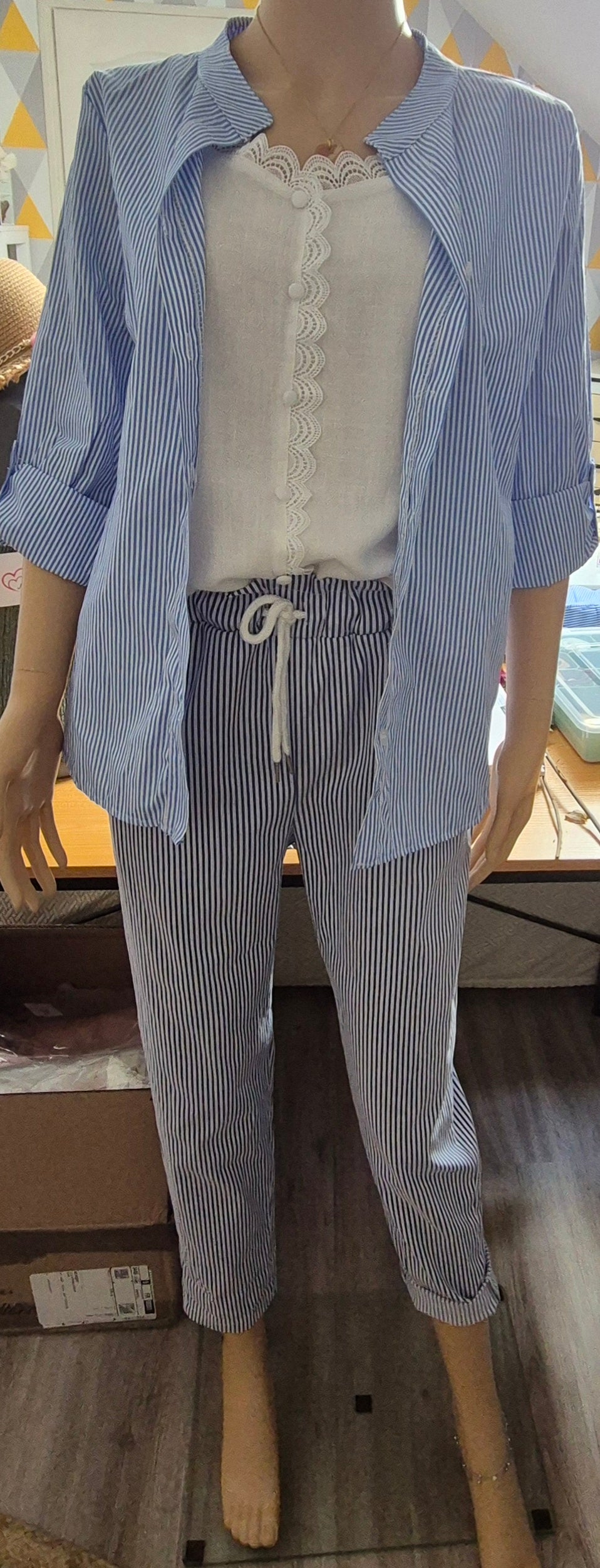 Joli pantalon rayé bleun élastique et ficelle a la taille.